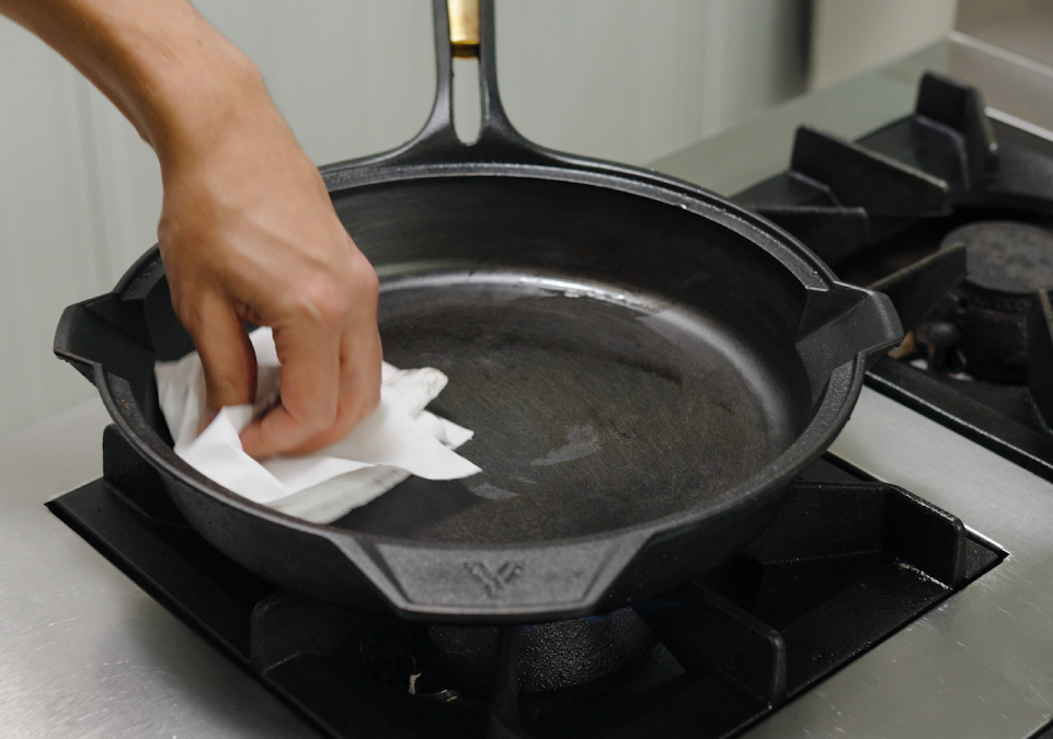 Use una toalla de papel sin pelusa o un trapo limpio para frotar con cuidado un poco más de aceite en la superficie de cocción interior de la sartén. Verás como se seca el aceite. Puedes aplicar un par de capas de aceite, siempre muy finas y uniformes, y dejar que penetren y humeen. Apaga el fuego y deja la sartén en su lugar para que se enfríe.